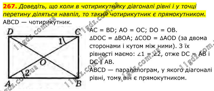 Доведіть, що коли в чотирикутнику діагоналі рівні і у точці перетину діляться навпіл, то такий чотирикутник є прямокутником. ABCD — чотирикутник. AC = BD; АО = ОС; DO = OB. ∆DOC = ∆ВОА; ∆COD = ∆AOD (за двома сторонами і кутом між ними). З їх рівності маємо: ∠1 = ∠2, отже DC = AB і DC ∥ AB. ABCD — паралелограм, у якого діагоналі рівні, тому він є прямокутником.