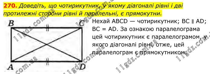 Доведіть, що чотирикутник, у якому діагоналі рівні і дві протилежні сторони рівні й паралельні, є прямокутни. Нехай ABCD — чотирикутник; BC ∥ AD; ВС = AD. За ознакою паралелограма цей чотирикутник є паралелограмом, у якого діагоналі рівні, отже, цей паралелограм є прямокутником.
