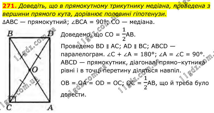 Доведіть, що в прямокутному трикутнику медіана, проведена з вершини прямого кута, дорівнює половині гіпотенузи. ∆ABC — прямокутний; ∠BCA = 90°; CO — медіана. Доведемо, що СО = 1/2АВ. Проведемо BD ∥ АС; AD ∥ ВС; ABCD — паралелограм. ∠С + ∠A = 180°; ∠A = ∠C = 90°. ABCD — прямокутник, діагоналі прямо–кутника рівні і в точці перетину діляться навпіл. ОВ = OА = OD = ОС; ОС = 1/2АВ, що й треба було довести.