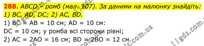 ABCD – ромб (мал. 107). За даними на малюнку знайдіть: 1) BC, AD, DC; 2) AC, BD. 1) ВC = AВ = 10 см; AD = 10 cм: DC = 10 cм; у ромба всі сторони рівні; 2) АС = 2АО = 16 см; BD = 2ВО = 12 см.