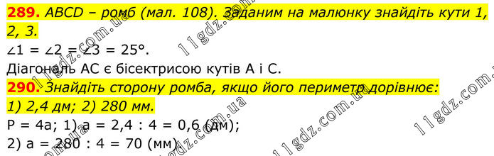 289. ABCD – ромб (мал. 108). Заданим на малюнку знайдіть кути 1, 2, 3. ∠1 = ∠2 = ∠3 = 25°. Діагональ АС є бісектрисою кутів А і С. 290. Знайдіть сторону ромба, якщо його периметр дорівнює: 1) 2,4 дм; 2) 280 мм. Р = 4а; 1) а = 2,4 : 4 = 0,6 (дм); 2) а = 280 : 4 = 70 (мм).