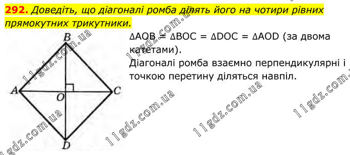 Доведіть, що діагоналі ромба ділять його на чотири рівних прямокутних трикутники. ∆АОВ = ∆ВОС = ∆DOC = ∆AOD (за двома катетами). Діагоналі ромба взаємно перпендикулярні і точкою перетину діляться навпіл.