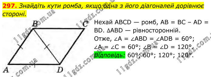 Знайдіть кути ромба, якщо одна з його діагоналей дорівнює стороні. Нехай ABCD — ромб, AB = ВС – AD = BD. ∆ABD — рівносторонній. Отже, ∠A = ∠ABD = ∠ADB = 60°; ∠A = ∠C = 60°; ∠B = ∠D = 120°. Відповідь: 60°; 60°; 120°; 120°.