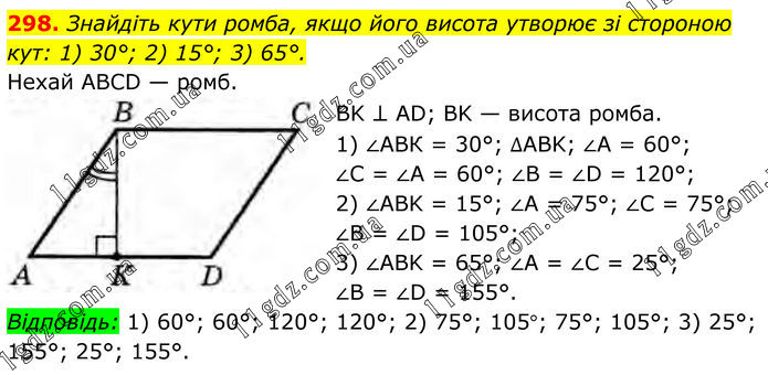 Знайдіть кути ромба, якщо його висота утворює зі стороною кут: 1) 30°; 2) 15°; 3) 65°. Нехай ABCD — ромб. BK ⊥ AD; BK — висота ромба. 1) ∠ABК = 30°; ∆ABK; ∠A = 60°; ∠С = ∠A = 60°; ∠B = ∠D = 120°; 2) ∠ABK = 15°; ∠A = 75°; ∠C = 75°; ∠B = ∠D = 105°; 3) ∠ABK = 65°; ∠A = ∠C = 25°; ∠В = ∠D = 155°. Відповідь: 1) 60°; 60°; 120°; 120°; 2) 75°; 105°; 75°; 105°; 3) 25°; 155°; 25°; 155°.