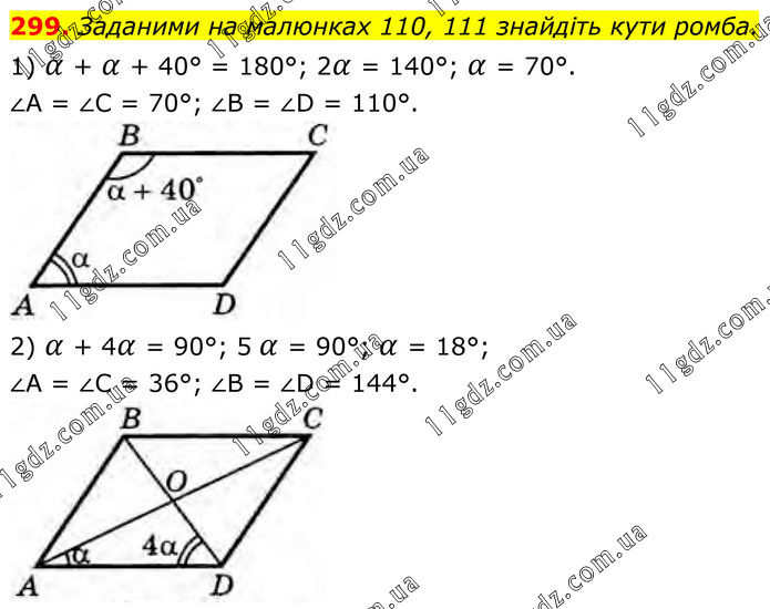 Заданими на малюнках 110, 111 знайдіть кути ромба. 1) α + α + 40° = 180°; 2α = 140°; α = 70°. ∠A = ∠C = 70°; ∠B = ∠D = 110°. 2) α + 4α = 90°; 5 α = 90°; α = 18°; ∠A = ∠C = 36°; ∠B = ∠D = 144°.