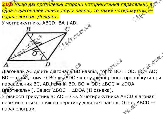 Якщо дві протилежні сторони чотирикутника паралельні, а одна з діагоналей ділить другу навпіл, то такий чотирикутник — паралелограм. Доведіть. У чотирикутника ABCD: BA ∥ AD. Діагональ AC ділить діагональ BD навпіл, тобто ВО = OD. ВС ∥ AD; BD — січна, тому ∠CBO = ∠ADO як внутрішні різносторонні кути при паралельних ВС, AD і січній BD. BO = OD; ∠BOC = ∠DOA (вертикальні). Звідси ∆ВОС = ∆DOA (II ознака). З рівності трикутників: АО = CO. У чотирикутника ABCD діагоналі перетинаються і точкою перетину діляться навпіл. Отже, ABCD — паралелограм.