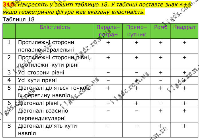 Накресліть у зошиті таблицю 18. У таблиці поставте знак «+» якщо геометрична фігура має вказану властивість. Таблиця 18