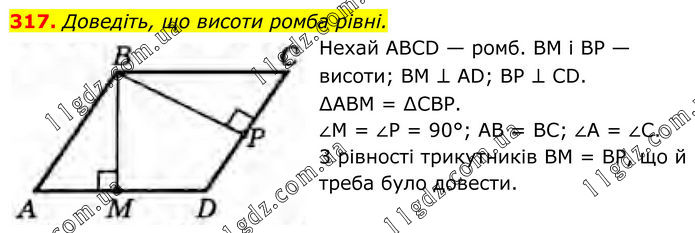 Доведіть, що висоти ромба рівні. Нехай ABCD — ромб. ВМ і ВР — висоти; ВМ ⊥ AD; BP ⊥ CD. ∆АВМ = ∆СВР. ∠M = ∠P = 90°; AB = ВС; ∠A = ∠C. 3 рівності трикутників ВМ = BP, що й треба було довести.