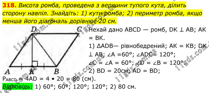 Висота ромба, проведена з вершини тупого кута, ділить сторону навпіл. Знайдіть: 1) кути ромба; 2) периметр ромба, якщо менша його діагональ дорівнює 20 см. Нехай дано ABCD — ромб, DK ⊥ АВ; АК = ВК. 1) ∆ADB— рівнобедрений; АК = КВ; DK ⊥ AB; ∠A = 60°; ∠ADC= 120°; ∠C = ∠A = 60°; ∠D = ∠B = 120°. 2) BD = 20cм; AD = BD; PABCD = 4AD = 4 • 20 = 80 (cм). Відповідь: 1) 60°; 60°; 120°; 120°; 2) 80 см.