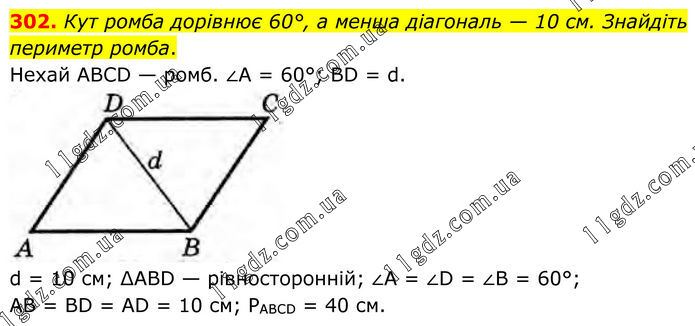 Кут ромба дорівнює 60°, а менша діагональ — 10 см. Знайдіть периметр ромба. Нехай ABCD — ромб. ∠A = 60°; BD = d. d = 10 cм; ∆ABD — рівносторонній; ∠A = ∠D = ∠В = 60°; AB = BD = AD = 10 cм; PABCD = 40 cм.