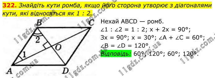 Знайдіть кути ромба, якщо його сторона утворює з діагоналями кути, які відносяться як 1 : 2. Нехай ABCD — ромб. ∠1 : ∠2 = 1 : 2; х + 2х = 90°; Зх = 90°; х = 30°; ∠A + ∠C = 60°; ∠B = ∠D = 120°. Відповідь: 60°; 120°; 60°; 120°.