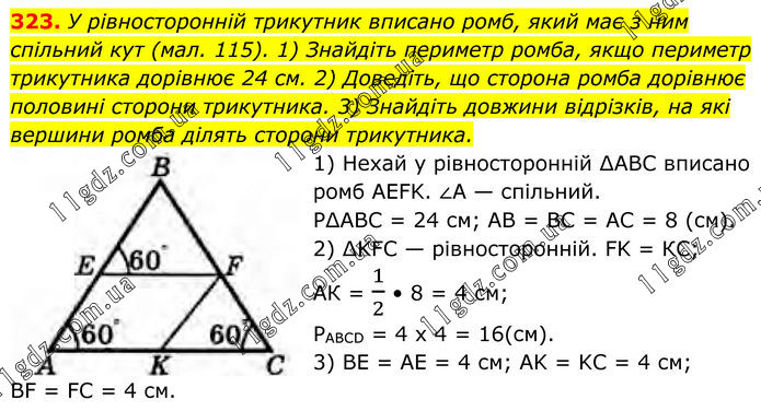 У рівносторонній трикутник вписано ромб, який має з ним спільний кут (мал. 115). 1) Знайдіть периметр ромба, якщо периметр трикутника дорівнює 24 см. 2) Доведіть, що сторона ромба дорівнює половині сторони трикутника. 3) Знайдіть довжини відрізків, на які вершини ромба ділять сторони трикутника. 1) Нехай у рівносторонній ∆АВС вписано ромб AEFK. ∠A — спільний. Р∆ABC = 24 см; AB = ВС = АС = 8 (см). 2) ∆KFC — рівносторонній. FK = КС; АК = 1/2 • 8 = 4 см; PABCD = 4 х 4 = 16(см). 3) ВE = AE = 4 см; АK = KС = 4 см; BF = FC = 4 cм.