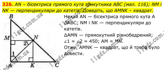 AN – бісектриса прямого кута трикутника ABC (мал. 116); NM і NK — перпендикуляри до катетів. Доведіть, що AMNK – квадрат. Нехай AN — бісектриса прямого кута А ∆АВС; NM і NK — перпендикуляри до катетів. ∆AMN — прямокутний рівнобедрений; ∠1 = ∠2 = 450; AM = MN. Отже, AMNK — квадрат, що й треба було довести.