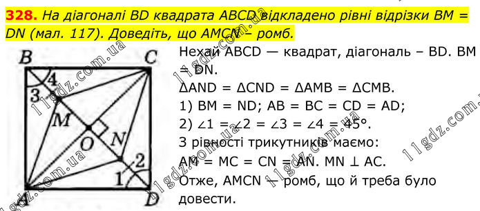 На діагоналі BD квадрата ABCD відкладено рівні відрізки BM = DN (мал. 117). Доведіть, що AMCN – ромб. Нехай ABCD — квадрат, діагональ – BD. BM = DN. ∆AND = ∆CND = ∆АМВ = ∆CMВ. 1) BM = ND; AB = BC = CD = AD; 2) ∠1 = ∠2 = ∠3 = ∠4 = 45°. З рівності трикутників маємо: AM = MC = CN = AN. MN ⊥ AC. Отже, AMCN — ромб, що й треба було довести.