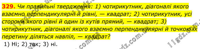 Чи правильні твердження: 1) чотирикутник, діагоналі якого взаємно перпендикулярні й рівні, — квадрат; 2) чотирикутник, усі сторони якого рівні й один із кутів прямий, — квадрат; 3) чотирикутник, діагоналі якого взаємно перпендикулярні й точкою їх перетину діляться навпіл, — квадрат? 1) Ні; 2) так; 3) ні.