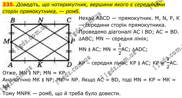 Доведіть, що чотирикутник, вершини якого є серединами сторін прямокутника, — ромб. Нехай ABCD — прямокутник. М, N, Р, К — середини сторін прямокутника. Проведемо діагоналі АС і BD; АС = BD. ∆АВС: MN — середня лінія; MN ∥ АС; MN = 1/2AC; ∆ADC: KP – середня лінія; KP ∥ AC; КР = 1/2АС. Отже, MN ∥ NP; MN = KP. Аналогічно МК ∥ NP; МК = NP. Якщо АС = BD, тоді MN = КР = МК = NP. Тому MNPK — ромб, що й треба було довести.