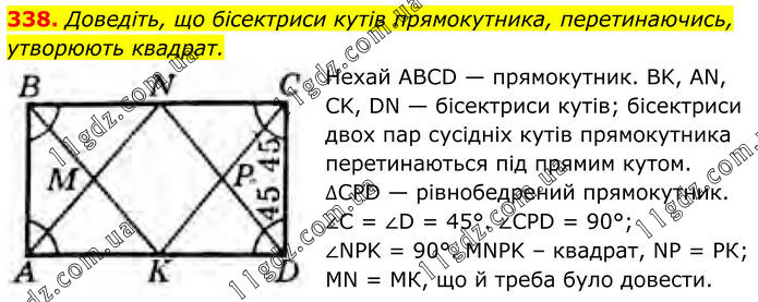 Доведіть, що бісектриси кутів прямокутника, перетинаючись, утворюють квадрат. Нехай АВСD — прямокутник. BK, AN, CK, DN — бісектриси кутів; бісектриси двох пар сусідніх кутів прямокутника перетинаються під прямим кутом. ∆CPD — рівнобедрений прямокутник. ∠C = ∠D = 45°. ∠СРD = 90°; ∠NPK = 90°. MNPK – квадрат, NP = РК; MN = МК, що й треба було довести.