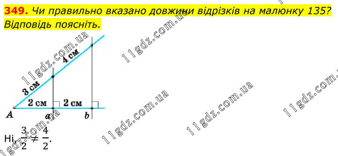 Чи правильно вказано довжини відрізків на малюнку 135? Відповідь поясніть. Ні, 3/2 ≠ 4/2.