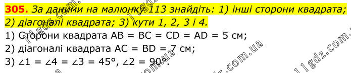За даними на малюнку 113 знайдіть: 1) інші сторони квадрата; 2) діагоналі квадрата; 3) кути 1, 2, 3 і 4. 1) Сторони квадрата AB = ВС = CD = AD = 5 cм; 2) діагоналі квадрата АС = BD = 7 см; 3) ∠1 = ∠4 = ∠3 = 45°, ∠2 = 90°.