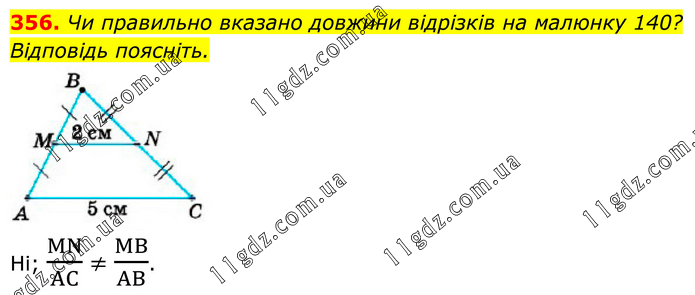 Чи правильно вказано довжини відрізків на малюнку 140? Відповідь поясніть. Ні; MN/AC ≠ MB/AB.