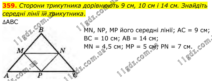 Сторони трикутника дорівнюють 9 см, 10 см і 14 см. Знайдіть середні лінії їй трикутника. ∆АВС MN, NP, MP його середні лінії; АС = 9 см; ВС = 10 см; AB = 14 см; MN = 4,5 см; МP = 5 см; PN = 7 см.