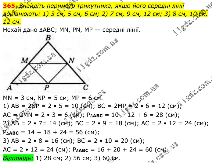 Знайдіть периметр трикутника, якщо його середні лінії дорівнюють: 1) 3 см, 5 см, 6 см; 2) 7 см, 9 см, 12 см; 3) 8 см, 10 см, 12 см. Нехай дано ∆АВС; MN, РN, МР — середні лінії. MN = З см, NP = 5 cм; MP = 6 см. 1) AB = 2NP = 2 • 5 = 10 (cм); ВС = 2МР = 2 • 6 = 12 (см); АС = 2MN = 2 • 3 = 6 (см); Р∆ABC = 10 + 12 + 6 = 28 (см); 2) АВ = 2 • 7= 14 (см); ВС = 2 • 9 = 18 (см); АС = 2 • 12 = 24 (см); P∆ABC = 14 + 18 + 24 = 56 (см); 3) АВ = 2 • 8 = 16 (см); ВС = 2 • 10 = 20 (см); АС = 2 • 12 = 24 (см); Р∆ABC = 16 + 20 + 24 = 60 (см). Відповідь: 1) 28 см; 2) 56 см; 3) 60 см.