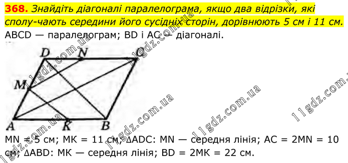 368. Знайдіть діагоналі паралелограма, якщо два відрізки, які сполучають середини його сусідніх сторін, дорівнюють 5 см і 11 см. ABCD — паралелограм; BD і AC — діагоналі. MN = 5 см; МК = 11 см; ∆ADC: MN — середня лінія; АС = 2MN = 10 см; ∆ABD: МК — середня лінія; BD = 2МК = 22 см.