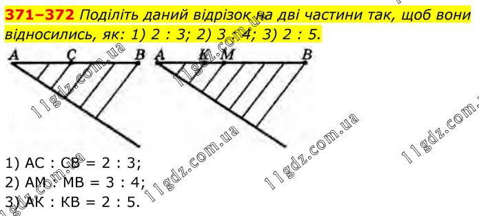 Поділіть даний відрізок на дві частини так, щоб вони відносились, як: 1) 2 : 3; 2) 3 : 4; 3) 2 : 5. 1) АС : СВ = 2 : 3; 2) AM : MB = 3 : 4; 3) АК : КВ = 2 : 5.