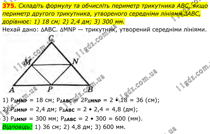 Складіть формулу та обчисліть периметр трикутника ABC, якщо периметр другого трикутника, утвореного середніми лініями ∆АВС, дорівнює: 1) 18 см; 2) 2,4 дм; 3) 300 мм. Нехай дано: ∆АВС. ∆МNР — трикутник, утворений середніми лініями. 1) Р∆MNP = 18 см; Р∆АВС = 2Р∆MNP = 2 • 18 = 36 (см); 2) P∆MNP = 2,4 дм; Р∆ABC = 2 • 2,4 = 4,8 (дм); 3) P∆MNF = 300 мм; Р∆ABC = 2 • 300 = 600 (мм). Відповідь: 1) 36 см; 2) 4,8 дм; 3) 600 мм.