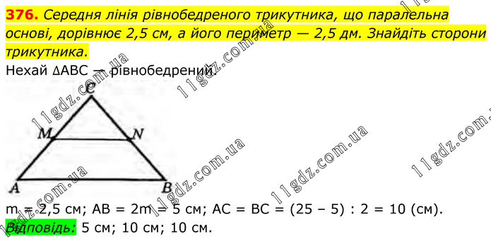 Середня лінія рівнобедреного трикутника, що паралельна основі, дорівнює 2,5 см, а його периметр — 2,5 дм. Знайдіть сторони трикутника. Нехай ∆АВС — рівнобедрений. m = 2,5 см; AB = 2m = 5 см; АС = ВС = (25 – 5) : 2 = 10 (см). Відповідь: 5 см; 10 см; 10 см.