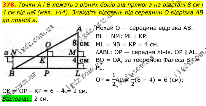 Точки А і В лежать з різних боків від прямої а на відстані 8 см і 4 см від неї (мал. 144). Знайдіть відстань від середини O відрізка AB до прямої а. Нехай О — середина відрізка AB. BL ⊥ NM; ML ∥ KP. ML = NB = КР = 4 см. ∆ABL: OP — середня лінія. OP ∥ AL. BO = OA, за теоремою Фалеса ВР = PL. ОР = 1/2AL = 1/2(8 + 4) = 6 (cм); ОК = ОР – КР = 6 – 4 = 2 см. Відповідь: 2 см.