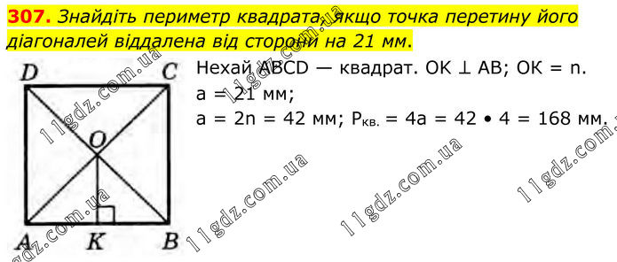 Знайдіть периметр квадрата, якщо точка перетину його діагоналей віддалена від сторони на 21 мм. Нехай АВСD — квадрат. ОK ⊥ АВ; ОК = n. а = 21 мм; а = 2n = 42 мм; Ркв. = 4а = 42 • 4 = 168 мм.