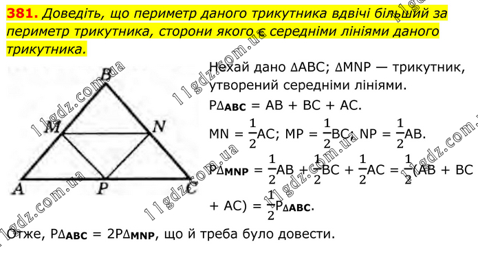 Доведіть, що периметр даного трикутника вдвічі більший за периметр трикутника, сторони якого є середніми лініями даного трикутника. Нехай дано ∆АВС; ∆MNP — трикутник, утворений середніми лініями. Р∆ABC = АВ + ВС + АС. MN = 1/2AC; МР = 1/2ВС; NP = 1/2AB. Р∆MNP = 1/2AB + 1/2ВС + 1/2АС = 1/2(АВ + ВС + АС) = 1/2P∆ABC. Отже, Р∆ABC = 2Р∆MNP, що й треба було довести.