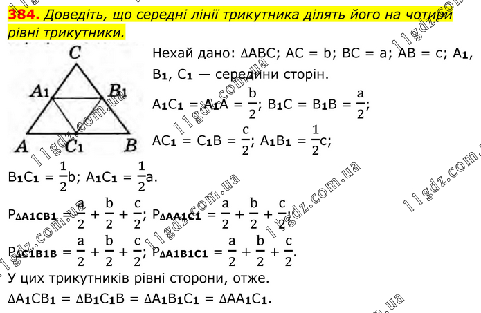 Доведіть, що середні лінії трикутника ділять його на чотири рівні трикутники. Нехай дано: ∆АВС; АС = b; ВС = а; АВ = с; A1, B1, С1 — середини сторін. A1C1 = A1A = b/2; B1C = B1B = a/2; AC1 = C1B = c/2; A1B1 = 1/2c; B1C1 = 1/2b; A1C1 = 1/2a. P∆A1CB1 = a/2 + b/2 + c/2; P∆AA1C1 = a/2 + b/2 + c/2; P∆C1B1B = a/2 + b/2 + c/2; P∆A1B1C1 = a/2 + b/2 + c/2. У цих трикутників рівні сторони, отже. ∆A1CB1 = ∆B1C1B = ∆A1B1C1 = ∆AА1С1.