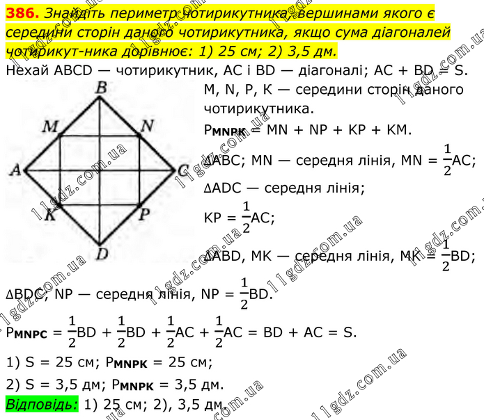 Знайдіть периметр чотирикутника, вершинами якого є середини сторін даного чотирикутника, якщо сума діагоналей чотирикутника дорівнює: 1) 25 cм; 2) 3,5 дм. Нехай ABCD — чотирикутник, АС і BD — діагоналі; АС + BD = S. М, N, Р, К — середини сторін даного чотирикутника. РМNРК = MN + NP + KP + KM. ∆ABC; MN — середня лінія, MN = 1/2AC; ∆ADC — середня лінія; KP = 1/2AC; ∆ABD, MK — середня лінія, MK = 1/2BD; ∆BDC; NP — середня лінія, NP = 1/2BD. PMNPC = 1/2BD + 1/2BD + 1/2AC + 1/2AC = BD + AC = S. 1) S = 25 см; PMNPK = 25 см; 2) S = 3,5 дм; PMNPK = 3,5 дм. Відповідь: 1) 25 см; 2), 3,5 дм.