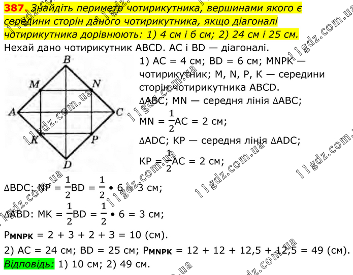 Знайдіть периметр чотирикутника, вершинами якого є середини сторін даного чотирикутника, якщо діагоналі чотирикутника дорівнюють: 1) 4 см і б см; 2) 24 см і 25 см. Нехай дано чотирикутник AВСD. АС і BD — діагоналі. 1) АС = 4 см; ВD = 6 см; MNPK — чотирикутник; М, N, Р, К — середини сторін чотирикутника ABCD. ∆АВС; MN — середня лінія ∆АВС; MN = 1/2AC = 2 см; ∆АDС; KP — середня лінія ∆АDС; КР = 1/2АС = 2 см; ∆BDC: NP = 1/2BD = 1/2 • 6 = 3 см; ∆ABD: MK = 1/2BD = 1/2 • 6 = 3 см; РMNPK = 2 + 3 + 2 + З = 10 (см). 2) АС = 24 см; ВD = 25 см; РMNPK = 12 + 12 + 12,5 + 12,5 = 49 (см). Відповідь: 1) 10 см; 2) 49 см.