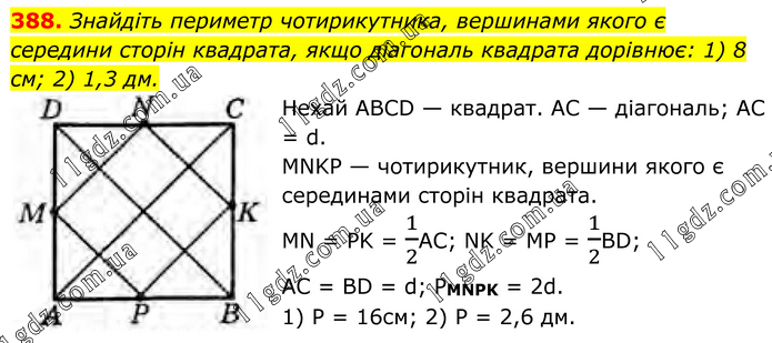 Знайдіть периметр чотирикутника, вершинами якого є середини сторін квадрата, якщо діагональ квадрата дорівнює: 1) 8 см; 2) 1,3 дм. Нехай ABCD — квадрат. AC — діагональ; AC = d. MNKP — чотирикутник, вершини якого є серединами сторін квадрата. MN = PK = 1/2AC; NK = MP = 1/2BD; AC = BD = d; PMNPK = 2d. 1) Р = 16см; 2) Р = 2,6 дм.