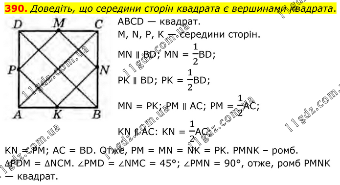 Доведіть, що середини сторін квадрата є вершинами квадрата. ABCD — квадрат. М, N, Р, К — середини сторін. MN ∥ BD; MN = 1/2BD; PK ∥ BD; PK = 1/2BD; MN = PK; PM ∥ AC; РМ = 1/2АС; KN ∥ АС: KN = 1/2AC; KN = PM; AC = BD. Отже, PM = MN = NK = PK. PMNK – ромб. ∆PDM = ∆NCM. ∠PMD = ∠NMC = 45°; ∠PMN = 90°, отже, ромб PMNK — квадрат.