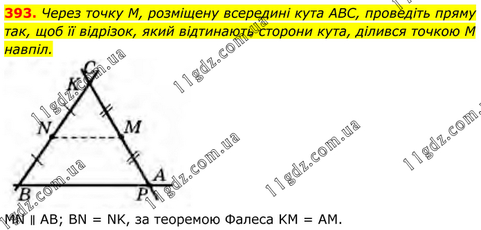 Через точку М, розміщену всередині кута ABC, проведіть пряму так, щоб її відрізок, який відтинають сторони кута, ділився точкою M навпіл. MN ∥ AB; BN = NK, за теоремою Фалеса KM = АМ.