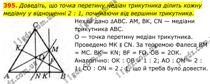 Доведіть, що точка перетину медіан трикутника ділить кожну медіану у відношенні 2 : 1, починаючи від вершини трикутника. Нехай дано ∆АВС. AM, ВK, CN — медіани трикутника ABC. О — точка перетину медіан трикутника. Проведемо МК ∥ CN. За теоремою Фалеса ВМ = МС. ВК = KN; BF = FO. OB = 2OК. Аналогічно: OK : OB = 1 : 2; АО : ОМ = 2 : 1; СО : ON = 2 : 1, що й треба було довести.