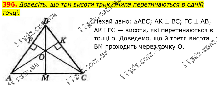 Доведіть, що три висоти трикутника перетинаються в одній точці. Нехай дано: ∆АВС; АК ⊥ ВС; FC ⊥ АВ; АК і FC — висоти, які перетинаються в точці о. Доведемо, що й третя висота ВМ проходить через точку O.