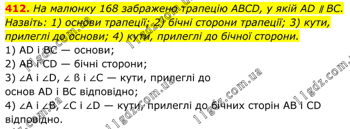 На малюнку 168 забражено трапецію ABCD, у якій AD ∥ BC. Назвіть: 1) основи трапеції; 2) бічні сторони трапеції; 3) кути, прилеглі до основи; 4) кути, прилеглі до бічної сторони. 1) AD i BC — основи; 2) АВ і CD — бічні сторони; 3) ∠A і ∠D, ∠ ß і ∠C — кути, прилеглі до основ AD і ВС відповідно; 4) ∠A і ∠B, ∠С і ∠D — кути, прилеглі до бічних сторін АВ і CD відповідно.