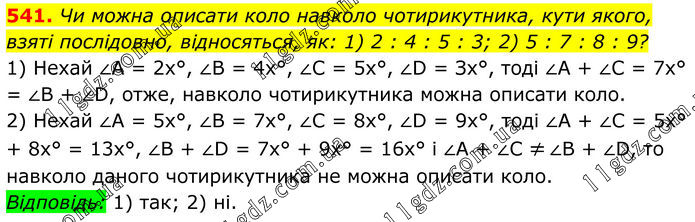 541. Чи можна описати коло навколо чотирикутника, кути якого, взяті послідовно, відносяться, як: 1) 2 : 4 : 5 : 3; 2) 5 : 7 : 8 : 9? 1) Нехай ∠A = 2x°, ∠B = 4x°, ∠C = 5х°, ∠D = Зx°, тоді ∠A + ∠C = 7x° = ∠B + ∠D, отже, навколо чотирикутника можна описати коло. 2) Нехай ∠A = 5х°, ∠B = 7х°, ∠C = 8x°, ∠D = 9х°, тоді ∠A + ∠C = 5х° + 8x° = 13x°, ∠B + ∠D = 7х° + 9х° = 16х° і ∠A + ∠C ≠ ∠B + ∠D, то навколо даного чотирикутника не можна описати коло. Відповідь: 1) так; 2) ні.