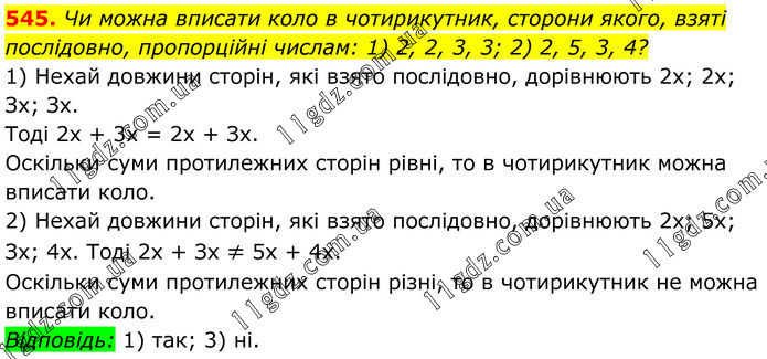 545. Чи можна вписати коло в чотирикутник, сторони якого, взяті послідовно, пропорційні числам: 1) 2, 2, 3, 3; 2) 2, 5, 3, 4? 1) Нехай довжини сторін, які взято послідовно, дорівнюють 2х; 2х; Зх; Зх. Тоді 2х + 3х = 2х + Зх. Оскільки суми протилежних сторін рівні, то в чотирикутник можна вписати коло. 2) Нехай довжини сторін, які взято послідовно, дорівнюють 2х; 5х; Зх; 4х. Тоді 2х + Зх ≠ 5х + 4х. Оскільки суми протилежних сторін різні, то в чотирикутник не можна вписати коло. Відповідь: 1) так; 3) ні.