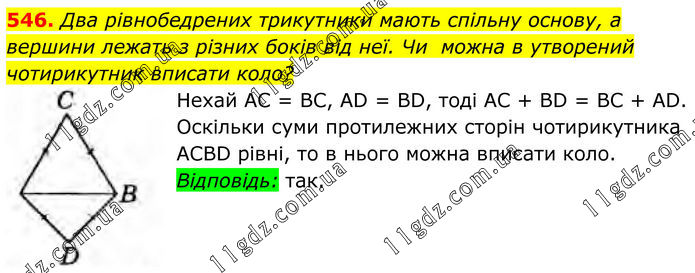 546. Два рівнобедрених трикутники мають спільну основу, а вершини лежать з різних боків від неї. Чи можна в утворений чотирикутник вписати коло? Нехай АС = ВС, AD = BD, тоді АС + BD = BC + AD. Оскільки суми протилежних сторін чотирикутника ACBD рівні, то в нього можна вписати коло. Відповідь: так.