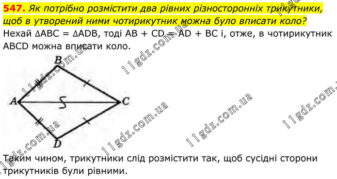 547. Як потрібно розмістити два рівних різносторонніх трикутники, щоб в утворений ними чотирикутник можна було вписати коло? Нехай ∆АВС = ∆ADB, тоді AB + CD = AD + ВС і, отже, в чотирикутник ABCD можна вписати коло. Таким чином, трикутники слід розмістити так, щоб сусідні сторони трикутників були рівними.
