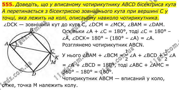 555. Доведіть, що у вписаному чотирикутнику ABCD бісектриса кута А перетинається з бісектрисою зовнішнього кута при вершині С у точці, яка лежить на колі, описаному навколо чотирикутника. ∠DCK — зовнішній кут до кута С, ∠DCM = ∠MCK, ∠BAM = ∠DAM. Оскільки ∠A + ∠C = 180°, тоді ∠C = 180° – ∠A, ∠DCK= 180° – (180° – ∠A) = ∠A. Розглянемо чотирикутник ABCN. У нього ∠BAM + ∠BCM = 1/2∠A + ∠BCD + 1/2∠A = ∠A + ∠BCD = 180°, тоді ∠ABC + ∠AMC = 360° – 180° = 180°. Чотирикутник ABCM — вписаний у коло, отже, точка М належить колу.