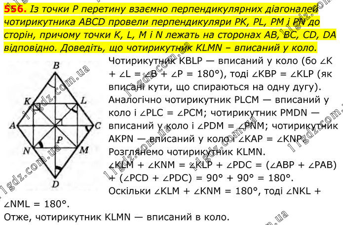 556. Із точки Р перетину взаємно перпендикулярних діагоналей чотирикутника ABCD провели перпендикуляри PK, PL, PM і PN до сторін, причому точки K, L, M і N лежать на сторонах AB, BC, CD, DA відповідно. Доведіть, що чотирикутник KLMN – вписаний у коло. Чотирикутник KBLP — вписаний у коло (бо ∠K + ∠L = ∠B + ∠P = 180°), тоді ∠KBP = ∠KLP (як вписані кути, що спираються на одну дугу). Аналогічно чотирикутник PLCM — вписаний у коло і ∠PLC = ∠PCM; чотирикутник PMDN — вписаний у коло і ∠PDM = ∠PNM; чотирикутник АKPN — вписаний у коло і ∠KAP = ∠KNP. Розглянемо чотирикутник KLMN. ∠KLM + ∠KNM = ∠KLP + ∠PDC = (∠ABP + ∠PAB) + (∠PCD + ∠PDC) = 90° + 90° = 180°. Оскільки ∠KLM + ∠KNM = 180°, тоді ∠NKL + ∠NML = 180°. Отже, чотирикутник KLMN — вписаний в коло.