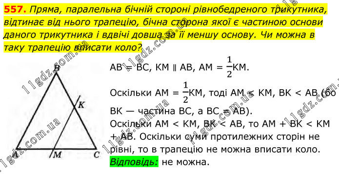 557. Пряма, паралельна бічній стороні рівнобедреного трикутника, відтинає від нього трапецію, бічна сторона якої є частиною основи даного трикутника і вдвічі довша за її меншу основу. Чи можна в таку трапецію вписати коло? АВ = ВС, КМ ∥ АВ, АM = 1/2KM. Оскільки AM = 1/2КМ, тоді AM < KM, BK < AB (бо ВК — частина ВС, а ВС = AB). Оскільки AM < KM, BK < AB, то AM + BK < KM + AB. Оскільки суми протилежних сторін не рівні, то в трапецію не можна вписати коло. Відповідь: не можна.