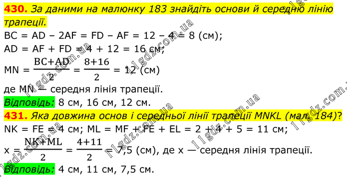 430. За даними на малюнку 183 знайдіть основи й середню лінію трапеції. ВС = AD – 2AF = FD – AF = 12 – 4 = 8 (см); AD = AF + FD = 4 + 12 = 16 cм; MN = (BC+AD)/2 = (8+16)/2 = 12 (см) де MN — середня лінія трапеції. Відповідь: 8 см, 16 см, 12 см. 431. Яка довжина основ і середньої лінії трапеції MNKL (мал. 184)? NK = FE = 4 cм; ML = MF + FE + EL = 2 + 4 + 5 = 11 cм; х = (NK+ML)/2 = (4+11)/2 = 7,5 (см), де x — середня лінія трапеції. Відповідь: 4 см, 11 см, 7,5 см.